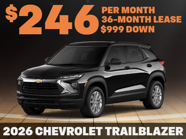Requires A1 credit and financing with GM Financial. Lease: No security deposit with approved credit. Low mile lease. Miles per year reflect the total odometer reading upon lease end. Actual mileage may vary based on current odometer reading. Requires GM Employee or Retiree Discount and current lease in the household with $999 down plus Startups, Fees, and Tax. LIMITED AVAILABILITY. Trailblazer MSRP $25,985. Offer expires 3/31/26 or while supplies last. See dealer for full details and qualifications.