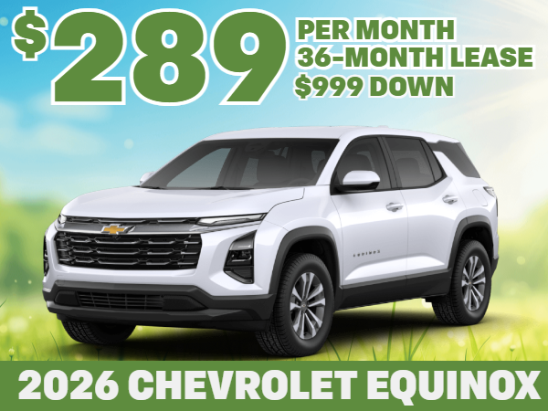 Requires A1 credit and financing with GM Financial. Lease: No security deposit with approved credit. Low mile lease. Miles per year reflect the total odometer reading upon lease end. Actual mileage may vary based on current odometer reading. Requires CTP, GM Employee or Retiree Discount, Current Lease in the household, GM Credit Card Sign Up and Spend rebate with $999 down plus Startups, Fees, and Tax. LIMITED AVAILABILITY. Equinox MSRP $34,055. Offer expires 4/30/26 or while supplies last. See dealer for full details and qualifications.